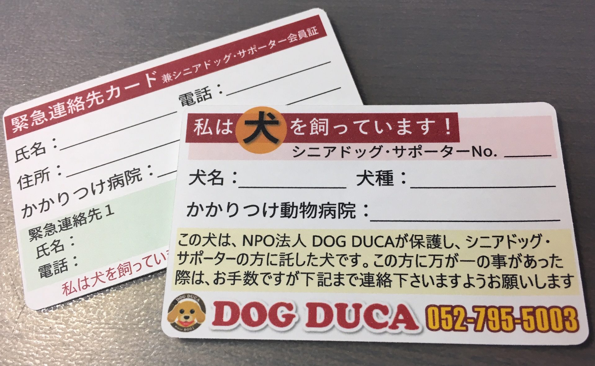 シニアドッグ・サポーターには、「緊急連絡先カード」と一緒になったシニアドッグ・サポーター会員証をお渡しし、万が一のことがあった場合、すぐにDOG DUCAに連絡がつき、犬を保護できるようにもしておきます。