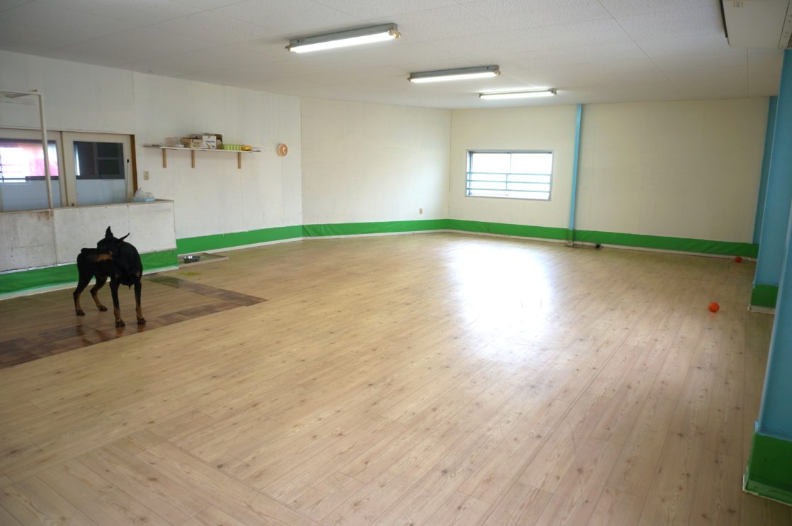 二階にある一番大きなスペースは、このように50kgのドーベルマンが入っても充分ゆとりがある広さで、もちろん冷暖房完備で足に優しいクッションフロア。雨や雪の日はもとより、夏の暑い日でも、充分運動することができますので運動不足の心配がありません。もちろん晴れた日は外に散歩に連れ出したり、公園に行き、屋外でのトレーニングも行っていますよ!