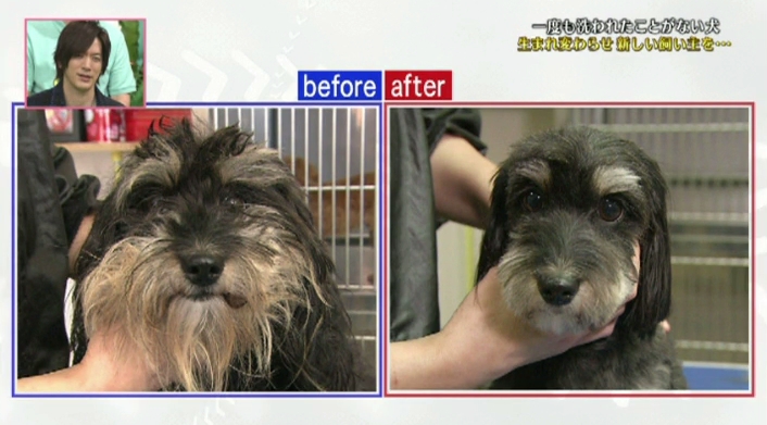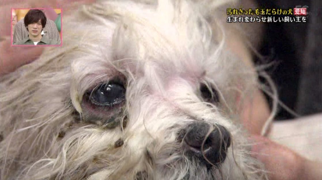 …愛知県名古屋市で保護された、顔が見えないほど全身の毛が伸び放題の犬。毛玉が酷すぎて、刈った毛は全部つながるほど。相葉くんがトリミングを終えると犬の印象ががらっと変わり…(紹介文ここまで)