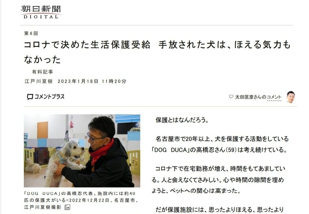 朝日新聞デジタルでの「コロナ禍による犬の飼育放棄」の取材でした!