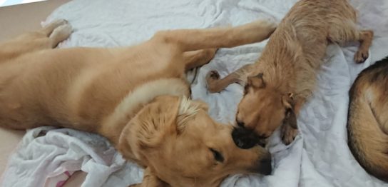 ゴールデンレトリーバーのふぅちゃんと 保護犬ジミー☆ とっても仲良しな二人です(……