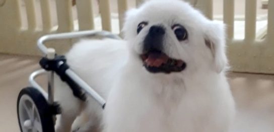 先日保護した下半身不随の12才のペキニーズのコユキ。 車イスを使って歩かせて……