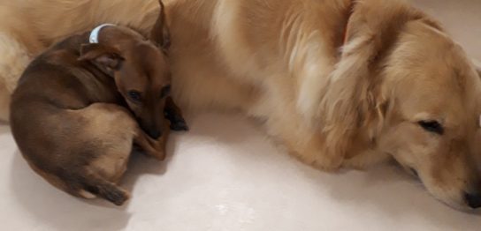 ゴールデンレトリーバーのマリウス君とミニチュアピンシャーのピース君! 散歩して、……