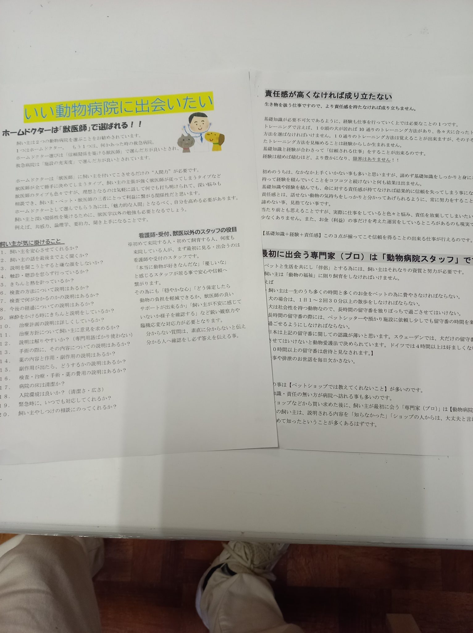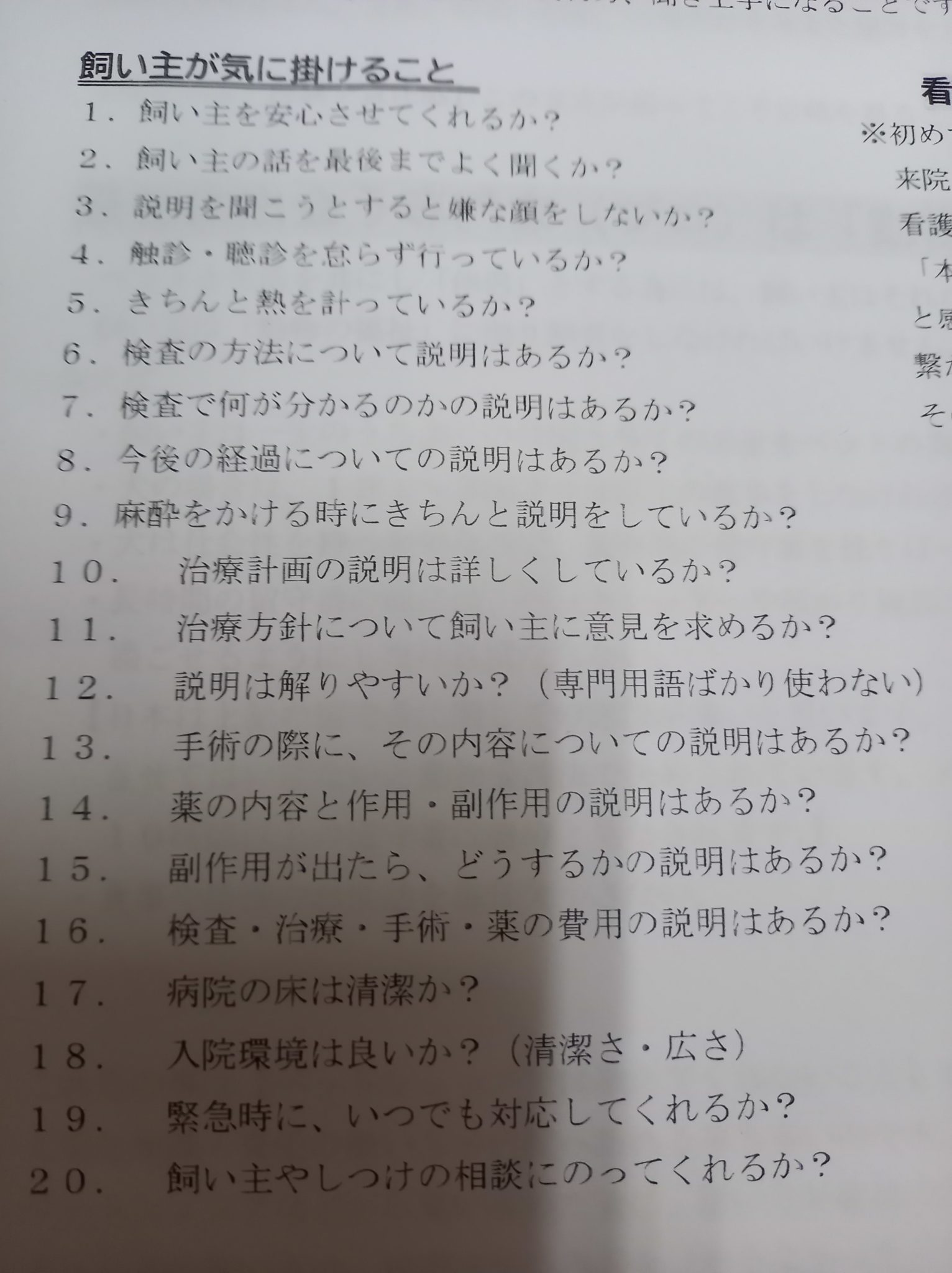 僕は、何でも気軽に話して何でも打ち明けられ相談でき、獣医師以外の受付、看護士など全てのスタッフの人柄、安心感、心の豊かさなど、病院に入った時の空気が大切なように思います。