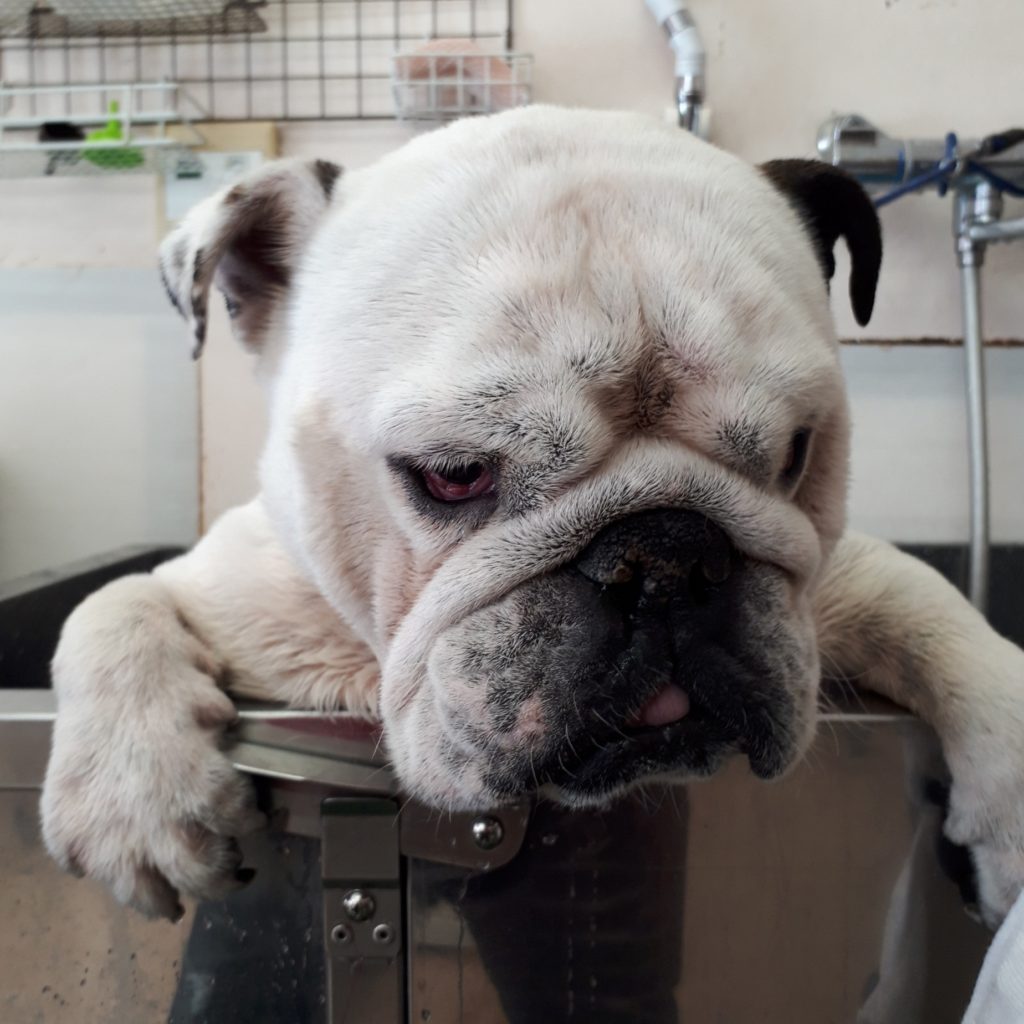 保護した方から『ブルドックの子を保護したんですが大変汚れているのでシャンプーや状態見てもらえますか?』と!