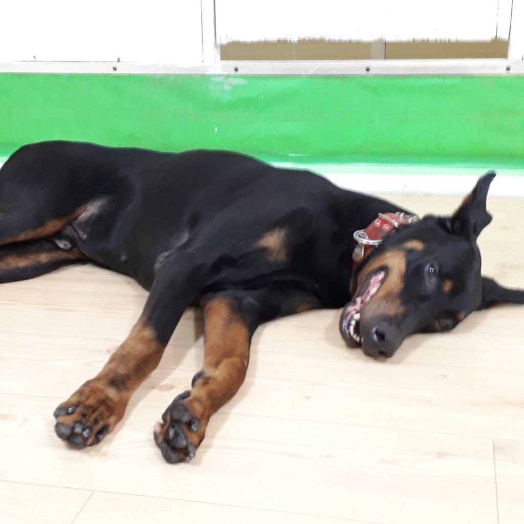 夜の散歩は、出来ず二階のトレーニングルームでの発散とトレーニングになったドーベルマンのヒカル!