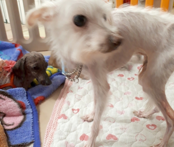左は皮膚病があって保護したダックス。右が栄養失調だったMIX