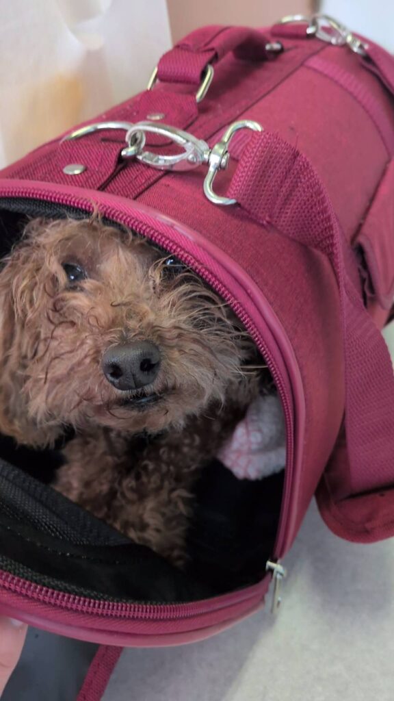 朝、ドッグデュッカのスタッフ出入口の角に、トイプードルの子がキャリーに入って遺棄されていました。