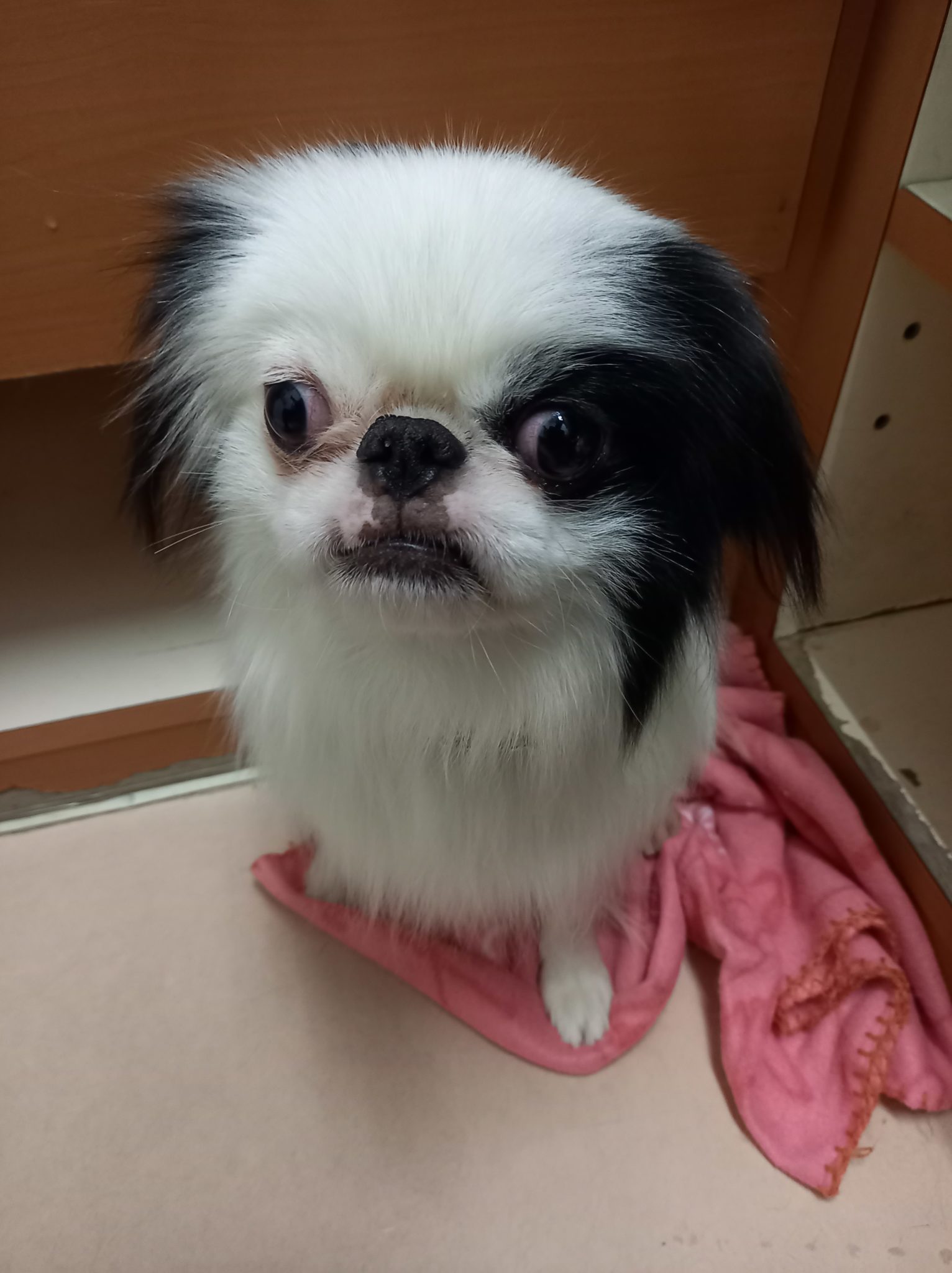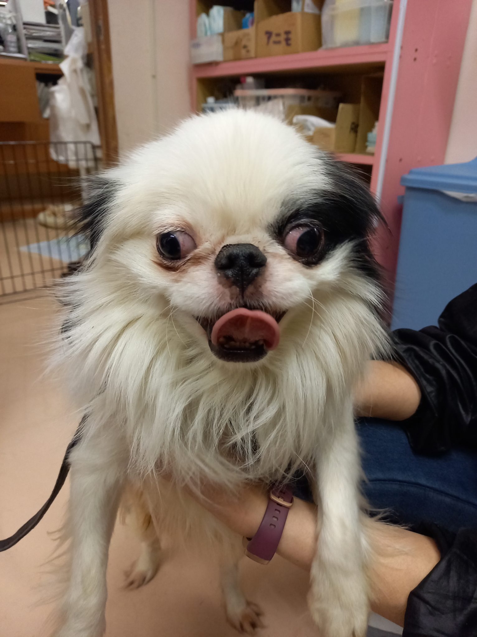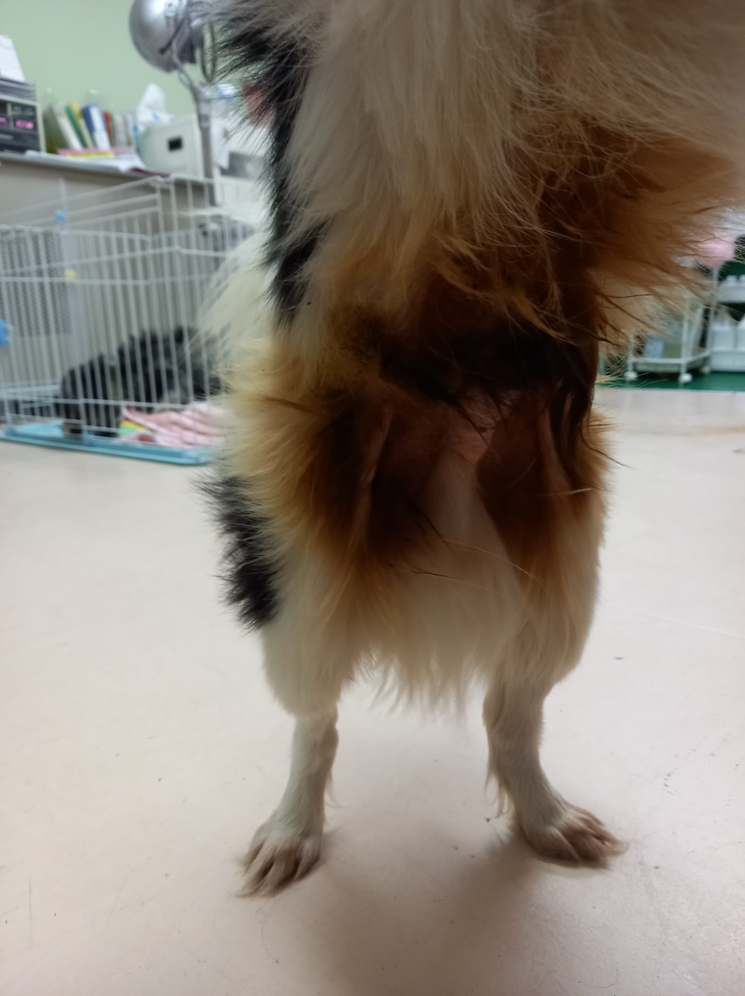 小さな玄関にリードで繋がれ、マナーベルトが巻かれたままでした。お腹は被れて毛もまっ茶色に。