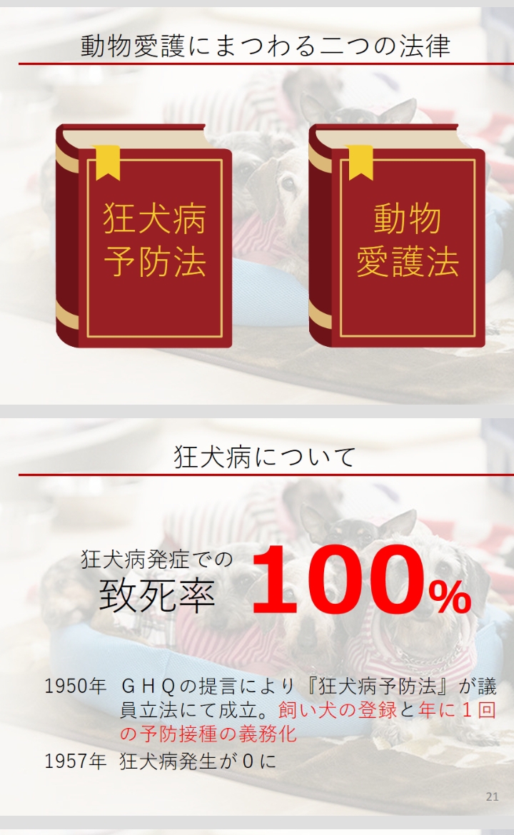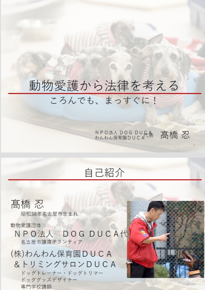 自己紹介から始まり動物愛護には啓発活動と保護活動の二種類あり動物愛護法には狂犬病予防法と動物愛護法があることなど、日本にも狂犬病があったことから人間を守るための狂犬病法の始まりの歴史、保護から愛護に変化していく動物愛護法の話し、その時代時代に起こっていく保護団体や行政の変化。様々な壁や新たに出てくる問題。我々保護団体の現実、日々繰り返される一つの命を救う想いと活動などを話してきました。最後に何故この仕事をやることになったのか?僕の失敗