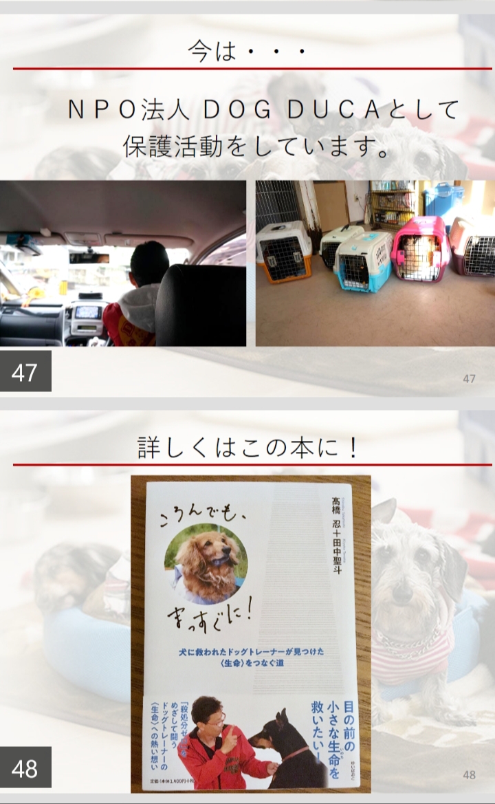 自己紹介から始まり動物愛護には啓発活動と保護活動の二種類あり動物愛護法には狂犬病予防法と動物愛護法があることなど、日本にも狂犬病があったことから人間を守るための狂犬病法の始まりの歴史、保護から愛護に変化していく動物愛護法の話し、その時代時代に起こっていく保護団体や行政の変化。様々な壁や新たに出てくる問題。我々保護団体の現実、日々繰り返される一つの命を救う想いと活動などを話してきました。最後に何故この仕事をやることになったのか?僕の失敗