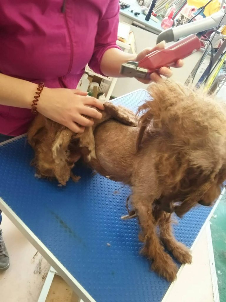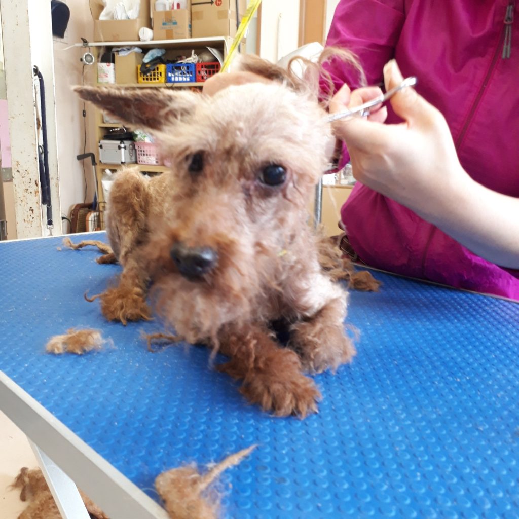 1ミリのバリカンとボブハサミで少しづつ皮膚にケガをさせないよう切目をいれながらカットです!