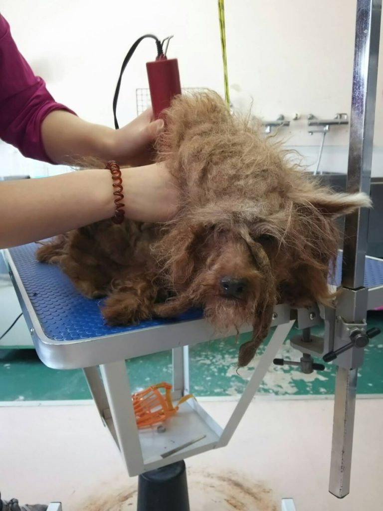 1ミリのバリカンとボブハサミで少しづつ皮膚にケガをさせないよう切目をいれながらカットです!