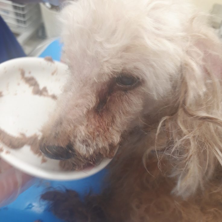 もう一頭のトイプードルは、伸びた毛が口の中に入り込み、さらにホコリなどの汚れがからまり、呼吸もうまくできず、ゴハンもうまく食べられないような状態でした。