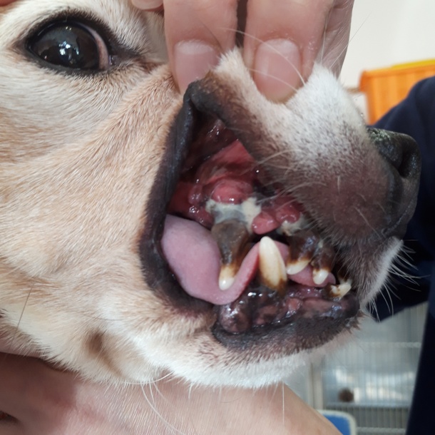 犬は、人間と違って歯を磨く習慣がないので、高齢になれば歯が悪くなって抜けていくものですが、この子はまだ7才で、抜ける歳でもありません。