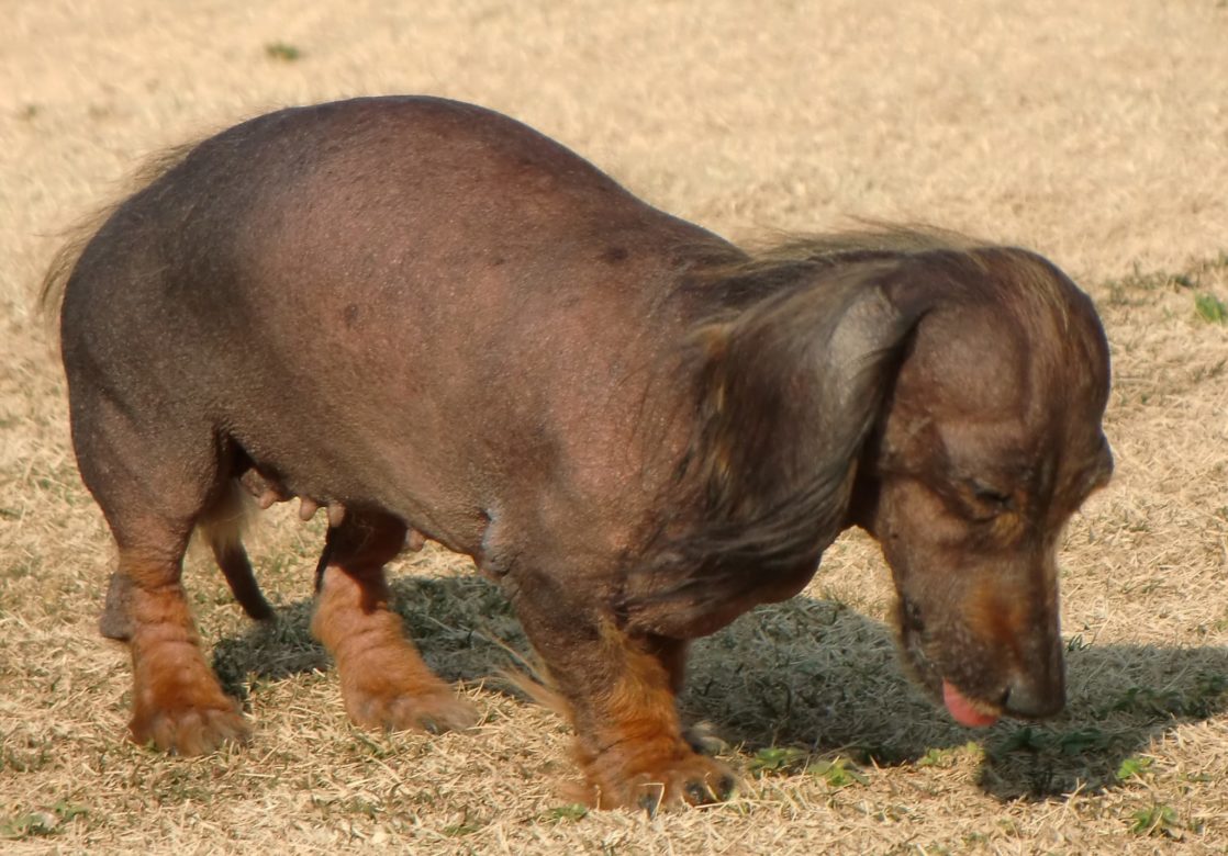 ミルクはデュッカと同じロングヘアーダックスでしたが、「アカラス」というニキビダニが原因で全身の毛が抜け落ち、皮膚は赤く、大変ひどい状態でした。