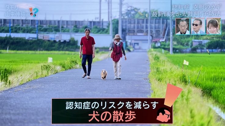 番組の内容は、同じくNHK「あしたが変わるトリセツショー」の認知症特集で取り上げられたときと同様の、認知症予防として、犬と暮らしている方は認知症発症リスクが4割低減され、その理由として「散歩」「社会とのコミュニケーション」などが挙げられていました。