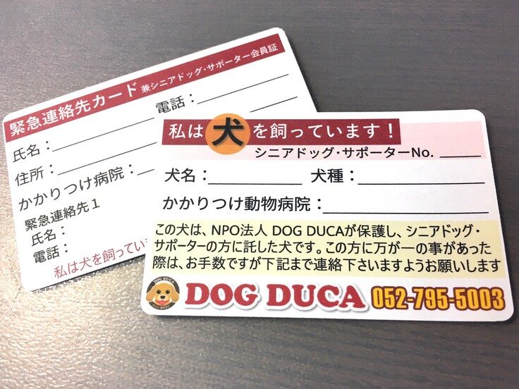 シニアドッグ・サポーター制度を使った里親さん(サポーターさん)には、DOG DUCAから緊急連絡先カードを渡しています。