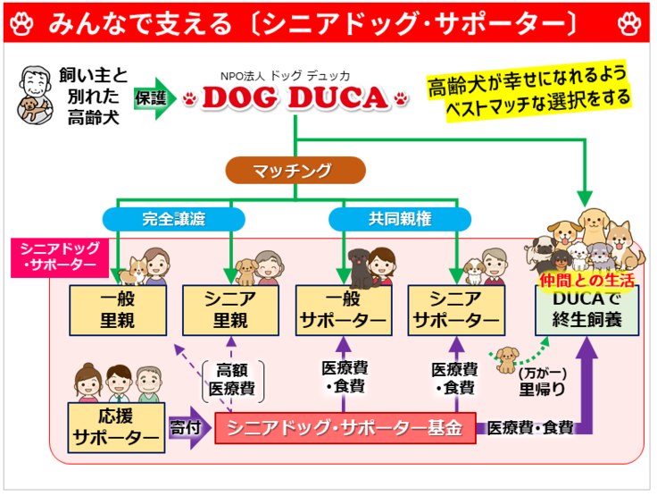 だから僕たちは、皆様の支援があって成り立つ、このシニアドッグ・サポーター制度をもっともっと「当たり前」のものにしていきたいのです。