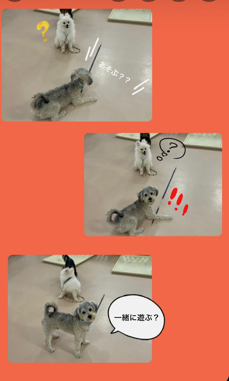 今日の保育園♬ 2022年12月22日 わんわん保育園日記 スタッフ内間 今日から保育園のポメラニアン・しらたまくん! 朝からmixのこげ茶くんに遊びに誘われ この後楽しそうに遊んでいました(^-^)*・*