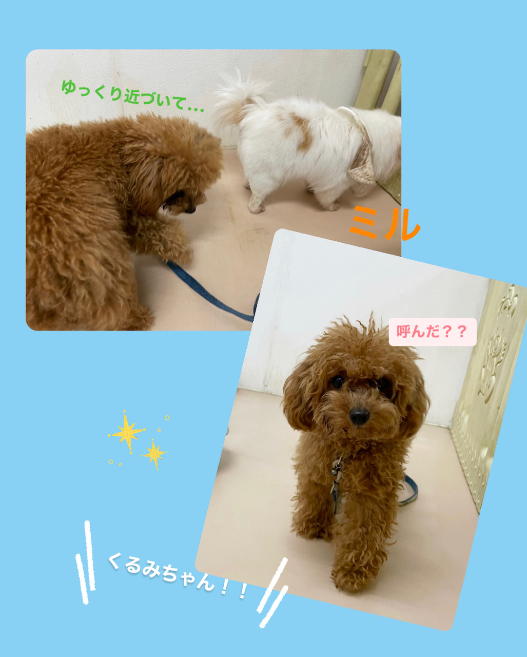 今日の保育園!! 2022年12月16日 わんわん保育園日記 スタッフ内間 今日が初めての保育園! シュナウザーのぎんたくんと TPのくるみちゃん☆ 怖がりな子は他の子と コミュニケーションが取れるよう スタッフがサポートさせていただいてます(*´∀`)♪