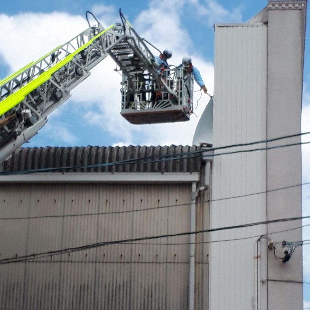 危険性が最大ですから119番に連絡し、はしご車によって4時間かけて危険性のあるトタンを撤去していただきました!