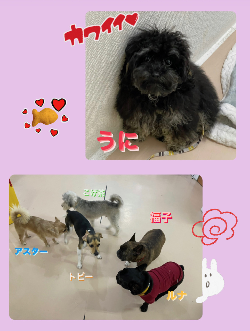 土曜日の保育園!! 2023年1月14日 わんわん保育園日記 スタッフ内間 今日から通園開始のうにちゃん♡ これからよろしくね(*´꒳`*)♫ 人懐っこい子が多いので、ボランティアさんが見えると「私!私!」とアピールが凄いです(笑)(๑>◡<๑)