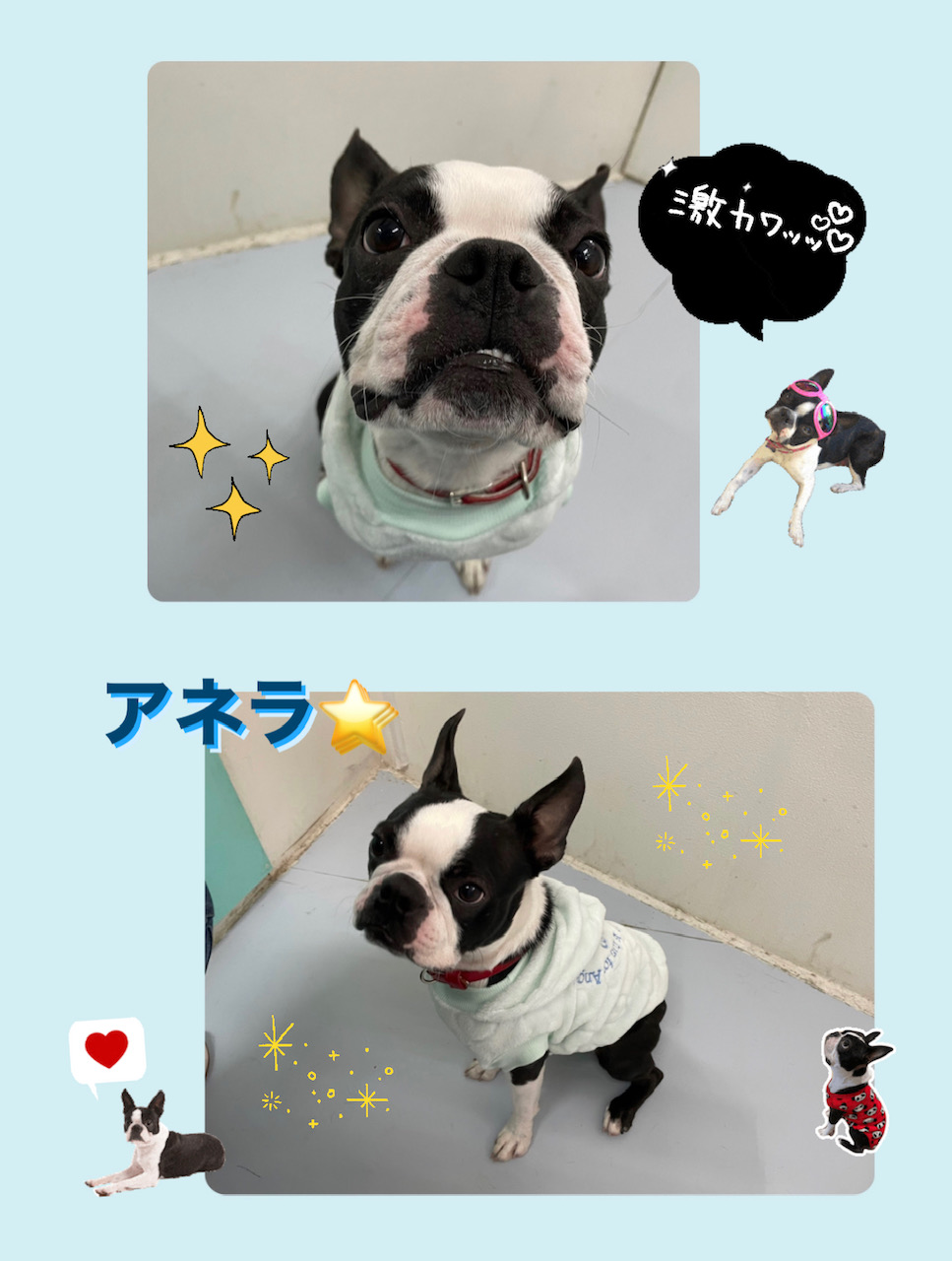 金曜日の保育園☆ 2023年2月3日 わんわん保育園日記 スタッフ内間 ボストンテリアのアネラくん! お洋服のご注文をいただき、早速園長がアネラくんに 似合うお洋服を作らせていただきました(๑>◡<๑) もこもこの生地で冬でも暖かく♪