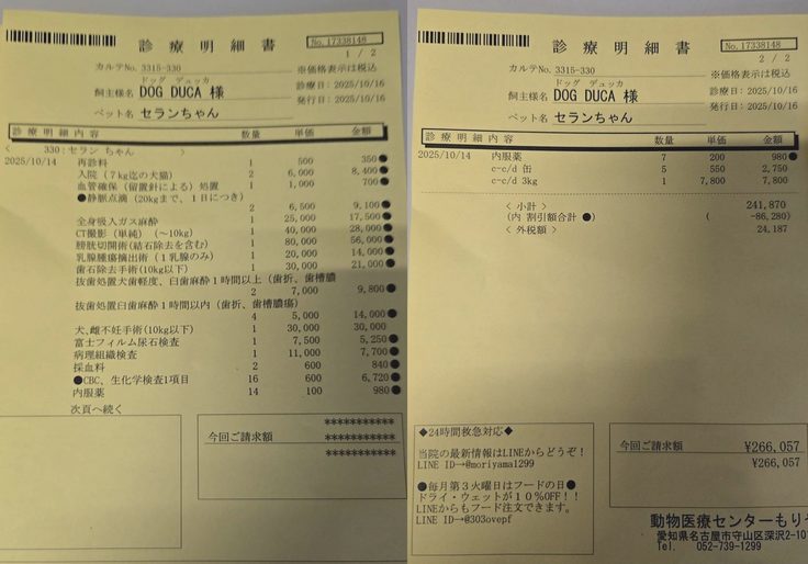 とくに、プロジェクト期間中に保護したイタグレの保護犬セランは、膀胱結石2cmの石が3個、乳腺腫瘍、歯の抜歯、クッシングもグレーゾーンで、手術と3日間の入院で25万円以上もかかりました(3割引した上で)。