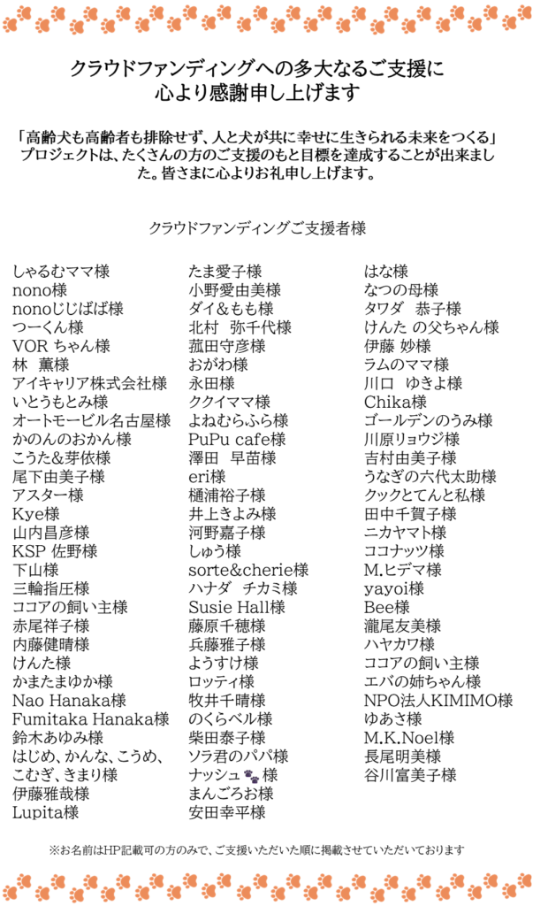 すでにご支援をいただいた方にはお礼メールをしておりますが、改めて、2025年7月30日から9月26日まで実施していた、クラウドファンディング「高齢犬も高齢者も排除せず、人と犬が共に幸せに生きられる未来をつくる」プロジェクトにご支援いただいた方、応援いただき、シェアしてくださった皆様、まことにありがとうございました。
